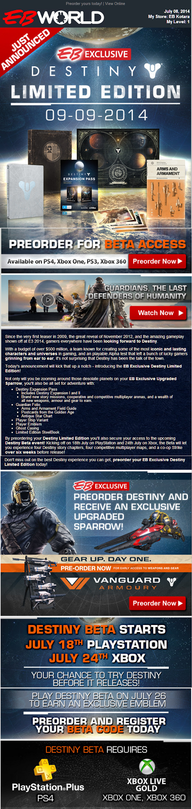 Pre-ordering will get you access to the upcoming Destiny Beta event! This will see you be granted access to four Destiny story chapters, four competitive multiplayer maps, and a co-op strike over six weeks before release.